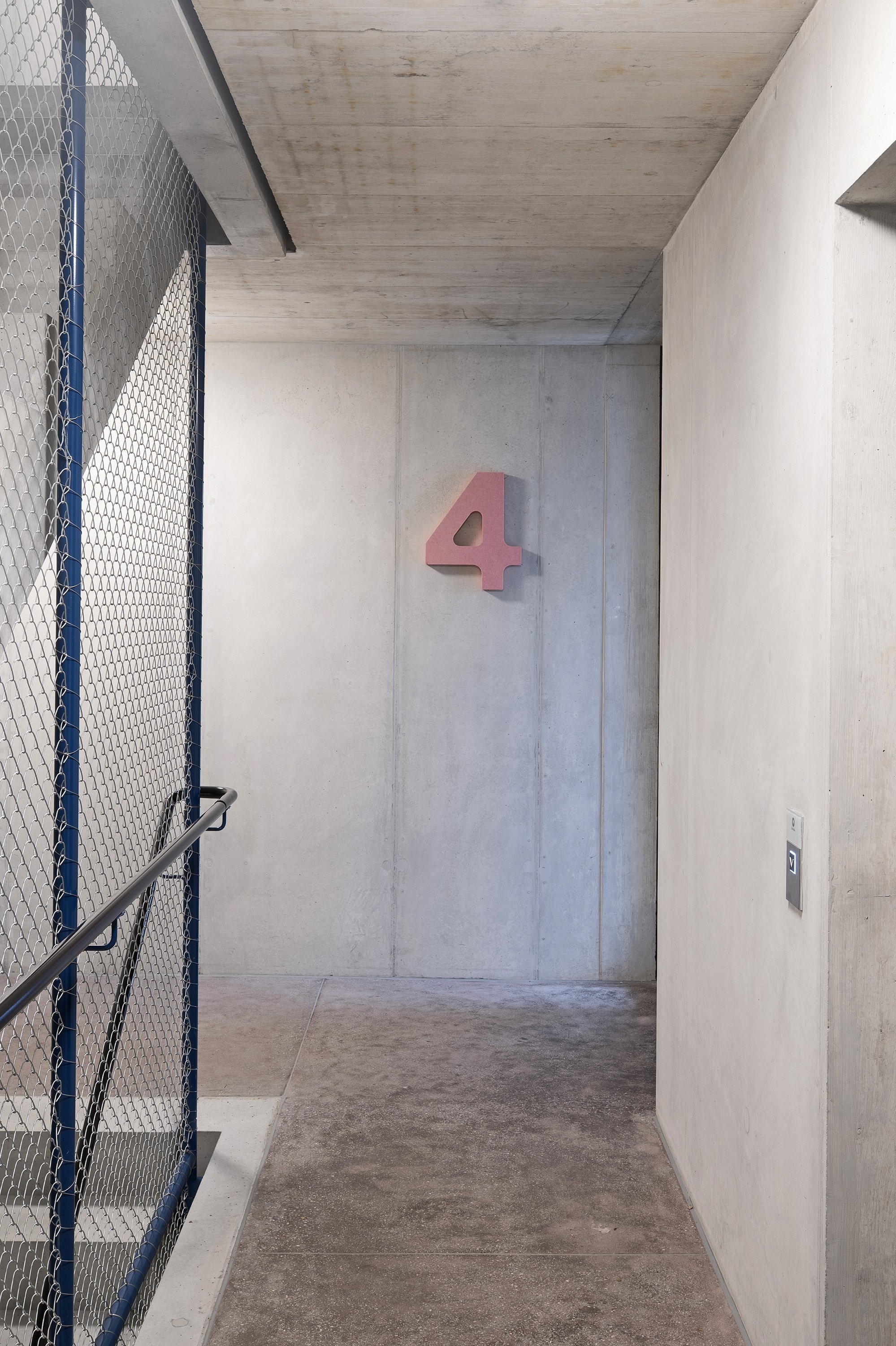 In der neu erstellten Wohnsiedlung in Zürich Albisrieden werden Erschliessungen und Stockwerke mit rezykliertem PET beschriftet. Im Aussenbereich mittels 3d-gedruckten Hohlkörpern und im Innenbereich mit Ziffern aus geschnittenem PET-Akkustikpanel. Anschriften sind für funktionale Räume, Parkgarage, Gemeinschaftsräume und den städtischen Kindergarten geklebt oder schabloniert beschriftet.